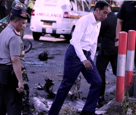 KAPOLRI JENDERAL TITO KARNAVIAN DAN PRESIDEN JOKO WIDODO. Meninjau salah satu gereja lokasi bom bunuh diri di Surabaya. Lalu tak kurang dari Presiden Joko Widodo sendiri memerlukan mengeluarkan ancaman menerbitkan Perppu Anti Terorisme bila DPR tak segera mengesahkan RUU tersebut. Foto head, Jenderal Tito Karnavian di depan Mako Brimob. (foto-foto download)