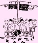 Partai Golongan Karya. Paling menakjubkan dalam fenomena ini adalah Partai Golongan Karya, yang secara historis adalah triumphant masa lampau sampai dua dekade lalu. Meski dalam Pemilu 1999 terdorong ke posisi kedua di bawah PDIP, angka raihan suaranya tak jelek-jelek amat. Bahkan dalam Pemilu 2004 kembali unggul berada di posisi pertama. Dalam Pemilihan Presiden secara langsung untuk pertama kali pada 2004 dan kemudian pada 2009 Golkar masih punya keberanian menampilkan calon presiden sendiri. Akan tetapi sejak Pemilihan Presiden 2014 Partai Golkar menjadi partai pengikut saja. Dan itu kemungkinan besar diulangi lagi kini dalam menghadapi Pemilihan Presiden 2019. Golkar telah kehilangan kendali inisiatif, dan mungkin juga kehilangan kepercayaan diri, yang satu dan lain sebab akibat kerapuhan internal yang membuka pintu kekuasaan mencampuri kedaulatannya sebagai partai mandiri. Follow the triumphant menjadi pilihan dalam konteks pilihan sikap pragmatis. Meski, dengan hasil raihan suara 2004 sebesar 14,75 persen, bukannya tak tersedia peluang kepeloporan dalam penciptaan jalur sendiri bersama satu-dua partai kecil lainnya.