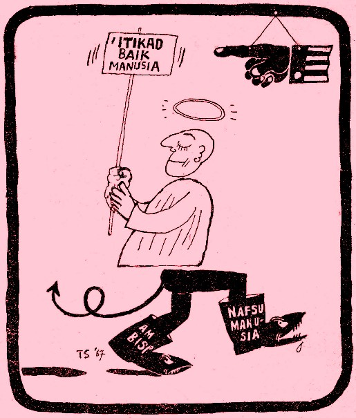 Dalam satu parodi, dikisahkan betapa Iblis telah kewalahan dengan involusi mental manusia. Lalu, mengajukan permohonan mengundurkan diri dari tugas menguji manusia, karena dalam beberapa kasus manusia terbukti sudah lebih iblis dari Iblis sendiri. Kebanyakan tak memiliki itikad baik lagi. Terutama dalam kehidupan politik demi kekuasaan. “Ya Tuhan, seringkali manusia sudah lebih keji dari kami… Kemampuan mereka memperdaya, menyebar hoax dan fitnah bahkan sudah melampaui batas imajinasi kami sendiri…”