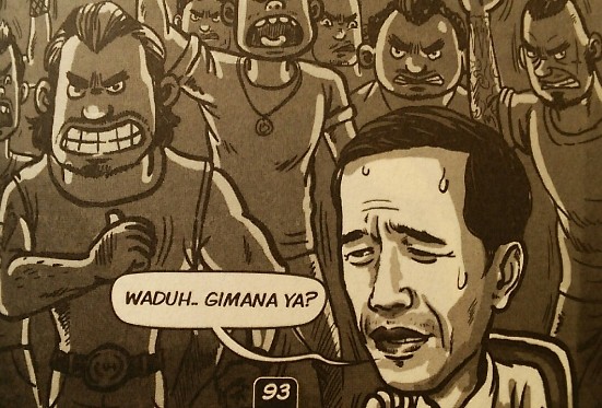 “Biarpun dia kurus dan gak ganteng, dia digadang-gadang rakyat agar kelak menjadi presiden,” demikian salah satu narasi dalam komik. “Beliau pemimpin yang rendah hati dan sangat peduli kepada rakyat. Ketika masih menjadi Walikota Solo, ia hampir tidak pernah mengambil gajinya…. Tetapi beliau mengonversi  gaji tersebut dengan uang pecahan 10.000 hingga 50.000 untuk dibagikan kepada warga yang benar-benar miskin.” Continue reading “74 Tahun Tertawa dan Menangis Bersama 7 Presiden (7)”